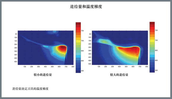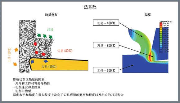 工件材料的不同導熱性以及其他加工因素,都會(huì )對熱量的分布產(chǎn)生顯著(zhù)影響。例如,高溫合金的導熱性較差。當加工導熱性較差的工件時(shí),傳入刀具的熱量會(huì )增加。此外,加工硬度較高的材料會(huì )比加工硬度較低的材料產(chǎn)生更多熱量。在通常情況下,更高的切削速度會(huì )增加熱量的產(chǎn)生,而更高的進(jìn)給量會(huì )加大切削刃中受高溫影響的區域。